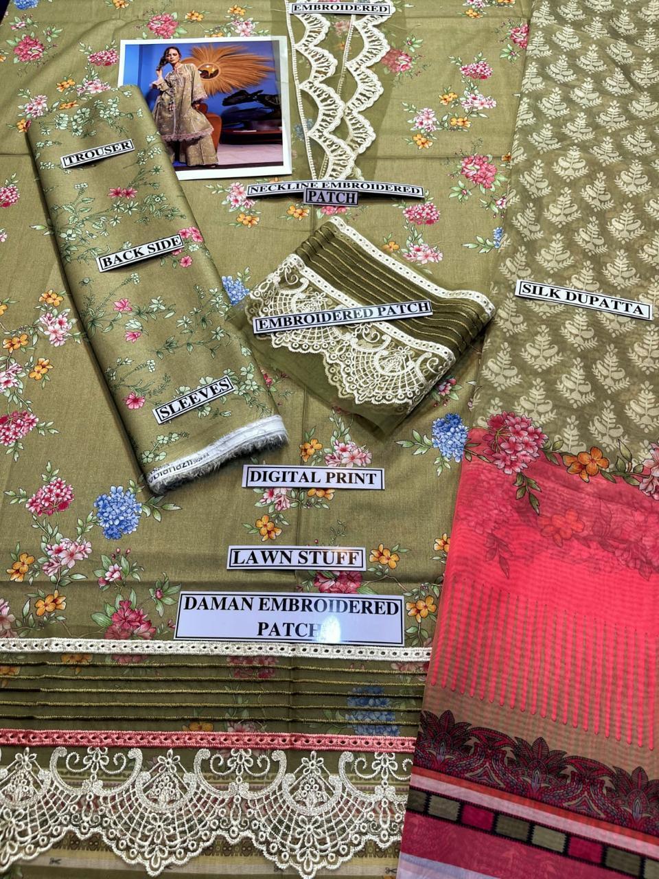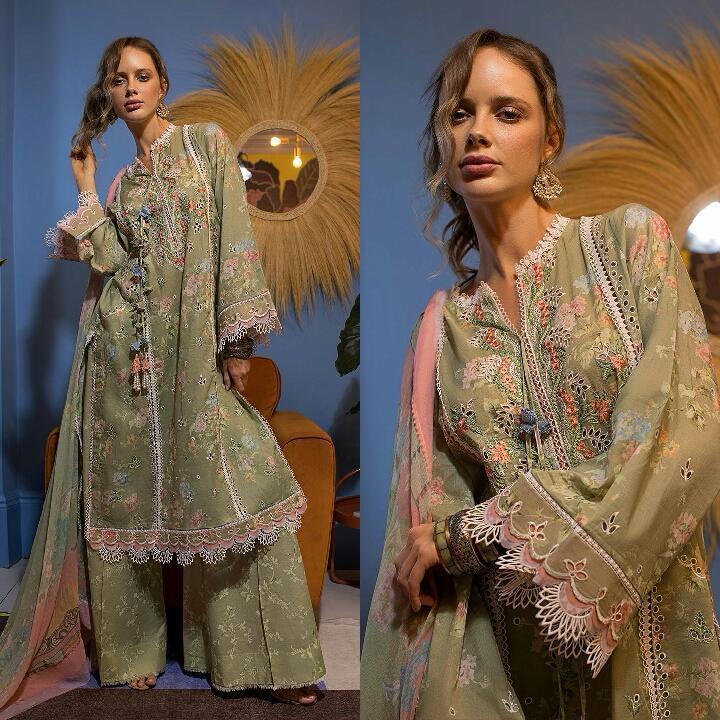 Step into elegance with this stunning green lawn suit featuring exquisite embroidered accents. This luxurious 3-piece set includes a beautifully printed shirt, plain trouser, and a chiffon dupatta with intricate embroidery. Perfect for any occasion, this outfit guarantees style and comfort, making it a must-have addition to your wardrobe.